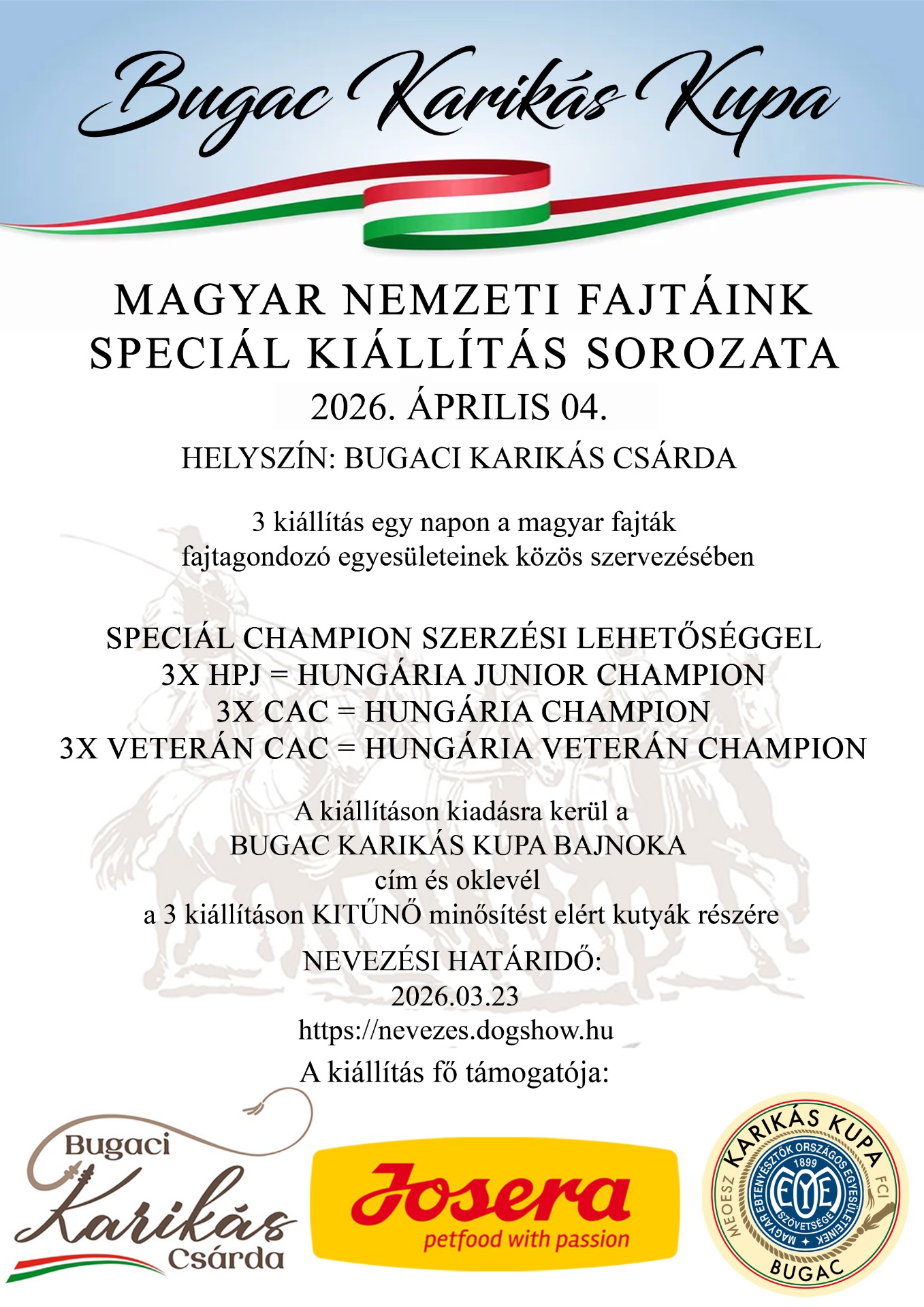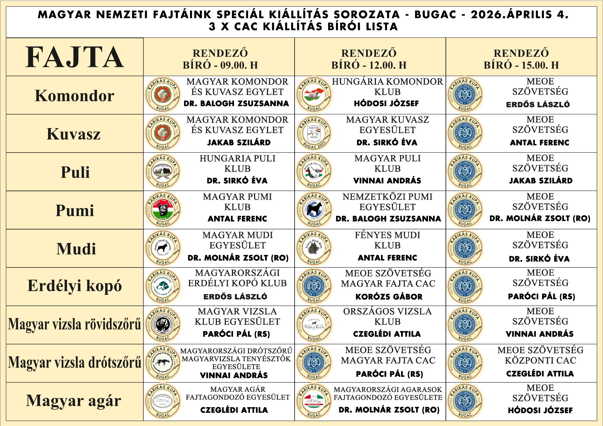 A Magyar Ebtenyésztők Országos Egyesületeinek Szövetsége (MEOESZ) szervezésében 2026. április 4-én Bugacon kerül megrendezésre második alkalommal a Karikás Kupa magyar kutyafajtás kiállítássorozat. A rendezvényen három kiállítás lesz egy napon: egy MEOESZ Magyar Fajtás CAC, egy MEOESZ Központi CAC és egy MEKK Speciál CAC kiállítás. Mindhárom kiállításon másik bíró fog bírálni.